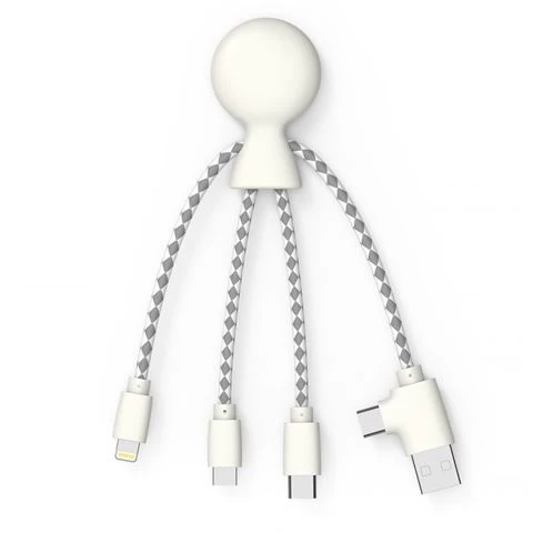 The Mr. Bio Multi-Cable by Xoopar is a multifunctional charging cable that is equipped with five connectors. With an environmentally friendly bio-degradable case and woven paper cable, this portable multi cable adapter features USB, Lightning, Type C, and Micro USB.